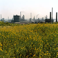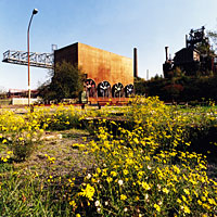 gelbe Korbblütler vor der Eisen- und Stahlhütte Beeckerwerth, Duisburg